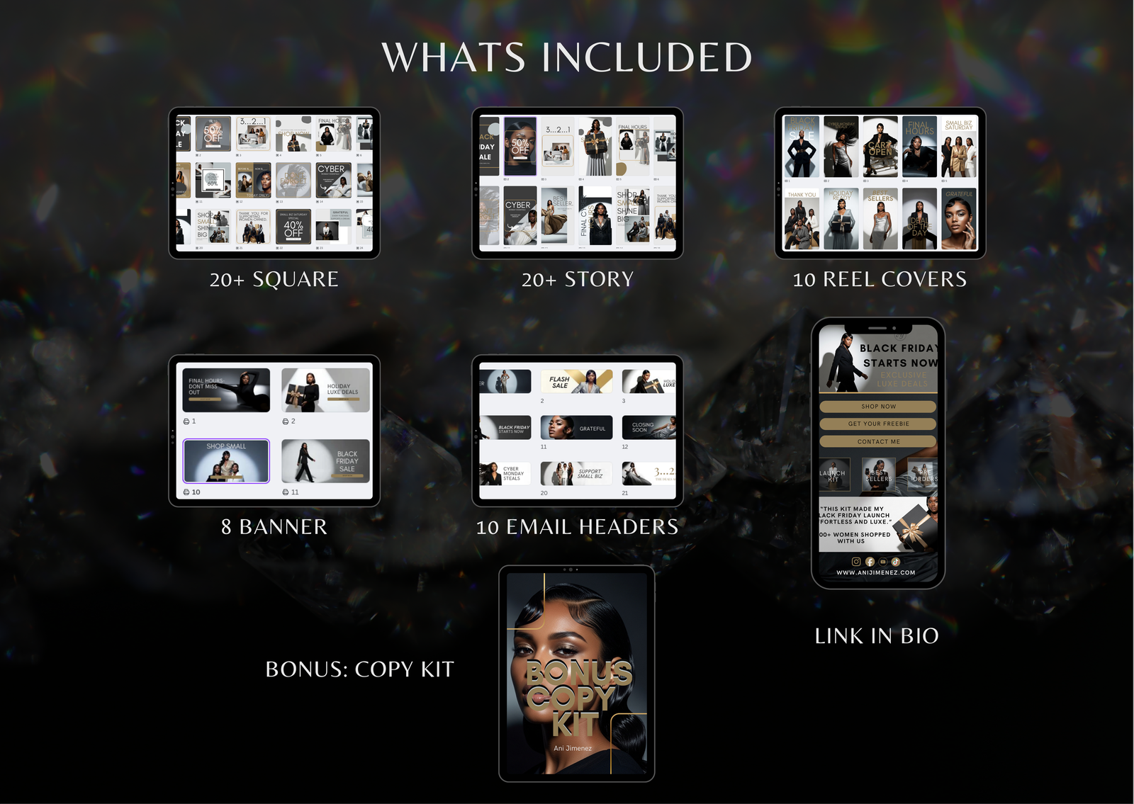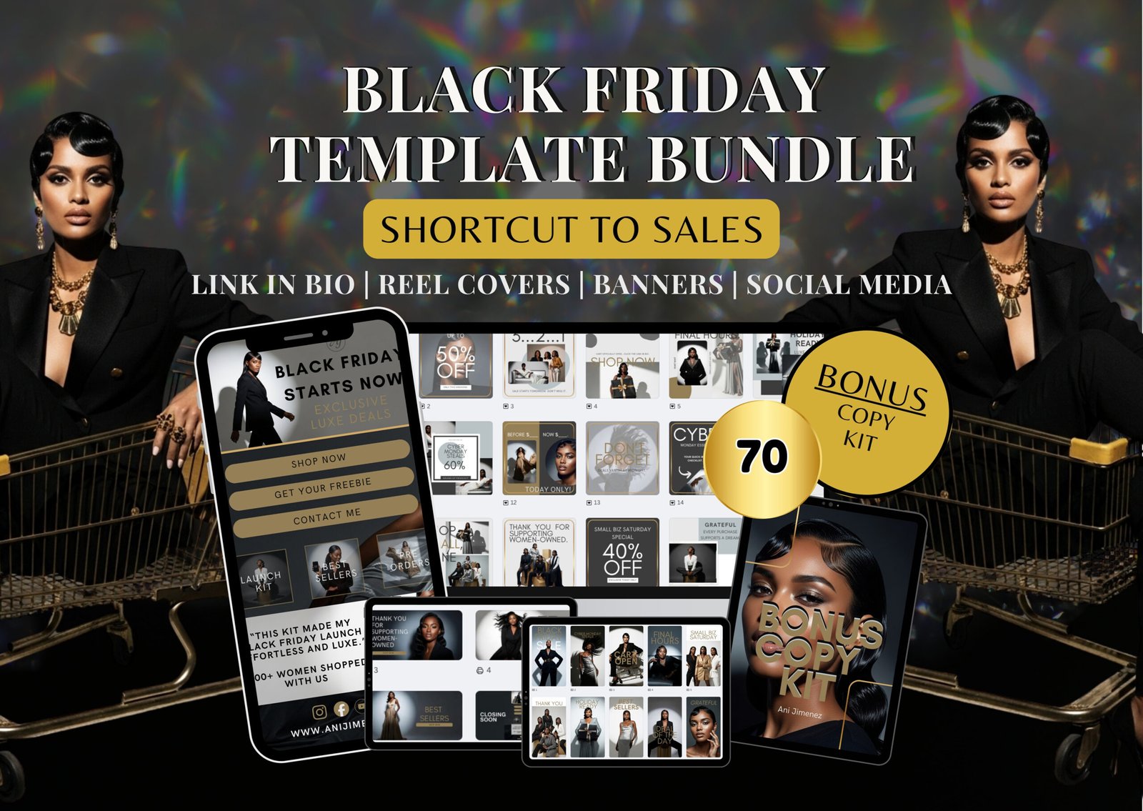 Designed in a minimalist luxury style (off-white, muted gold, deep charcoal, silver-grey) with bold editorial energy, this bundle gives coaches, creators, and small business owners everything they need to stand out during the busiest sales weekend of the year.