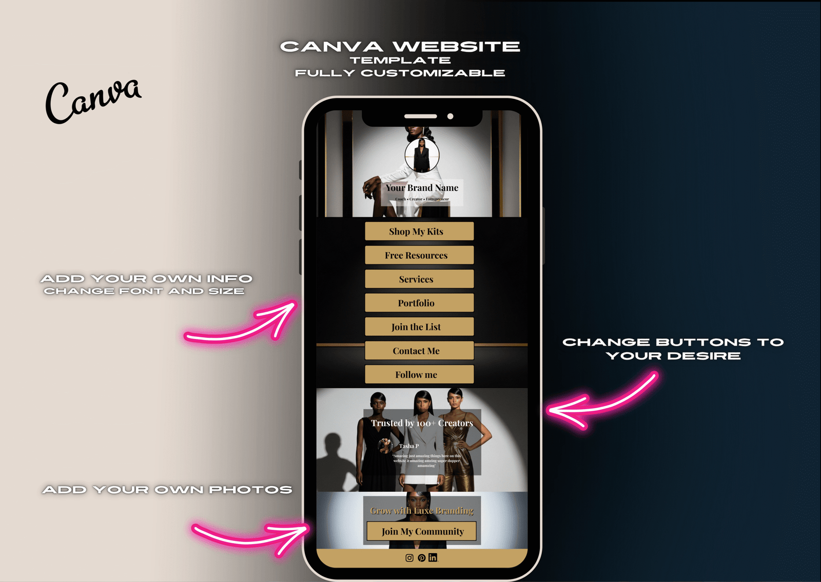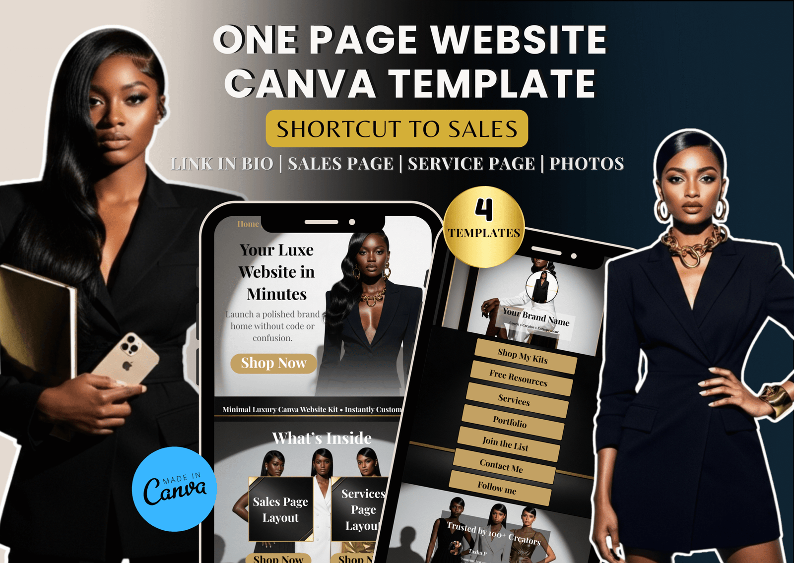 This kit includes 4 layouts you can customize and publish instantly as a one-page scrolling website or link-in-bio: